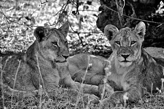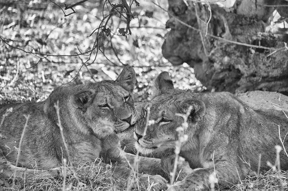 The absence of colour allows us to focus on their expressive eyes, the texture of their fur, and the intensity of their gaze.